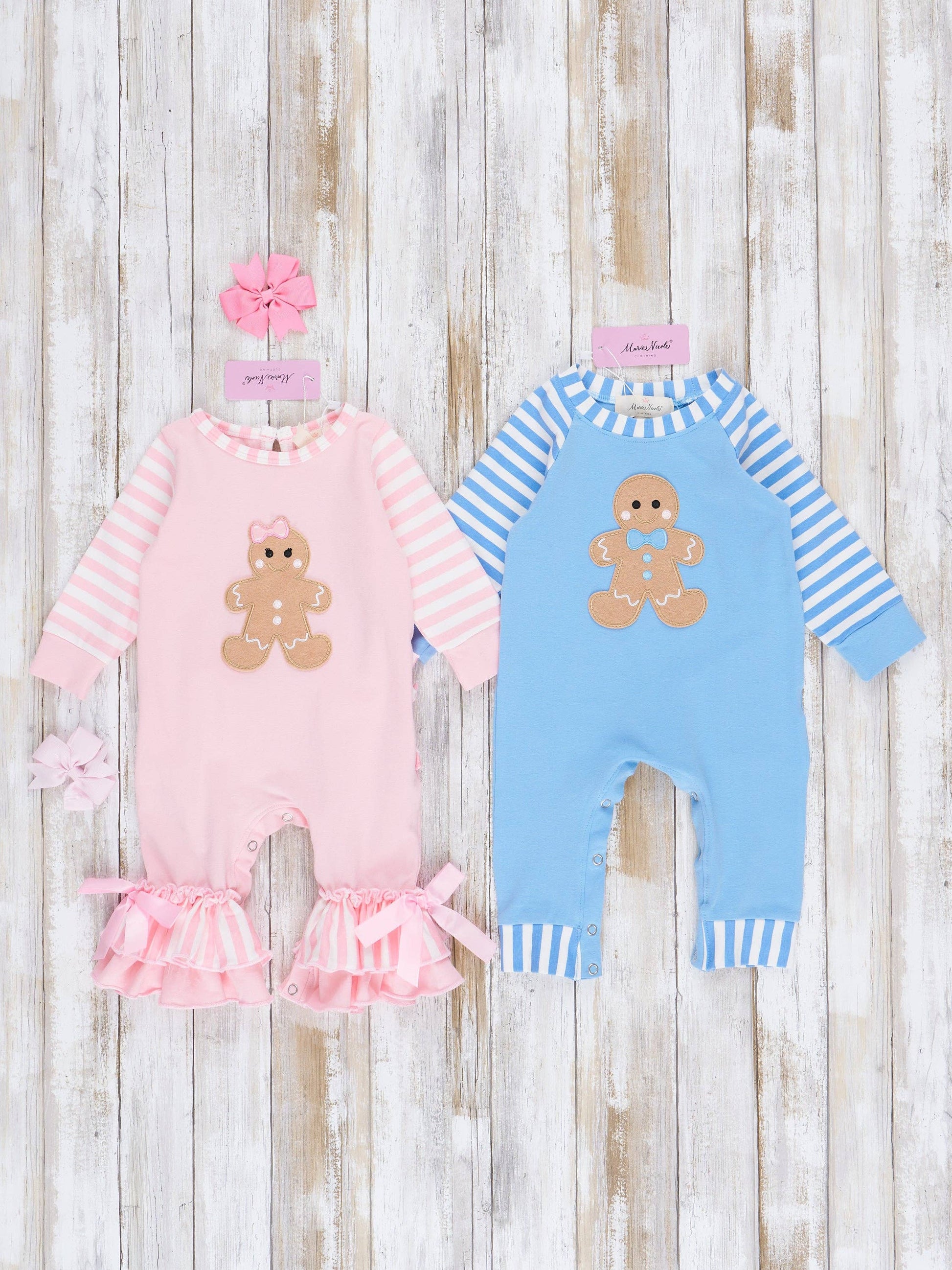 The cutest jammies for brother & sister to match in this Christmas (or year-round -we won't judge)! They're 100% super soft cotton with the right amount of stretch for a comfy fit. We love this gingerbread applique! *