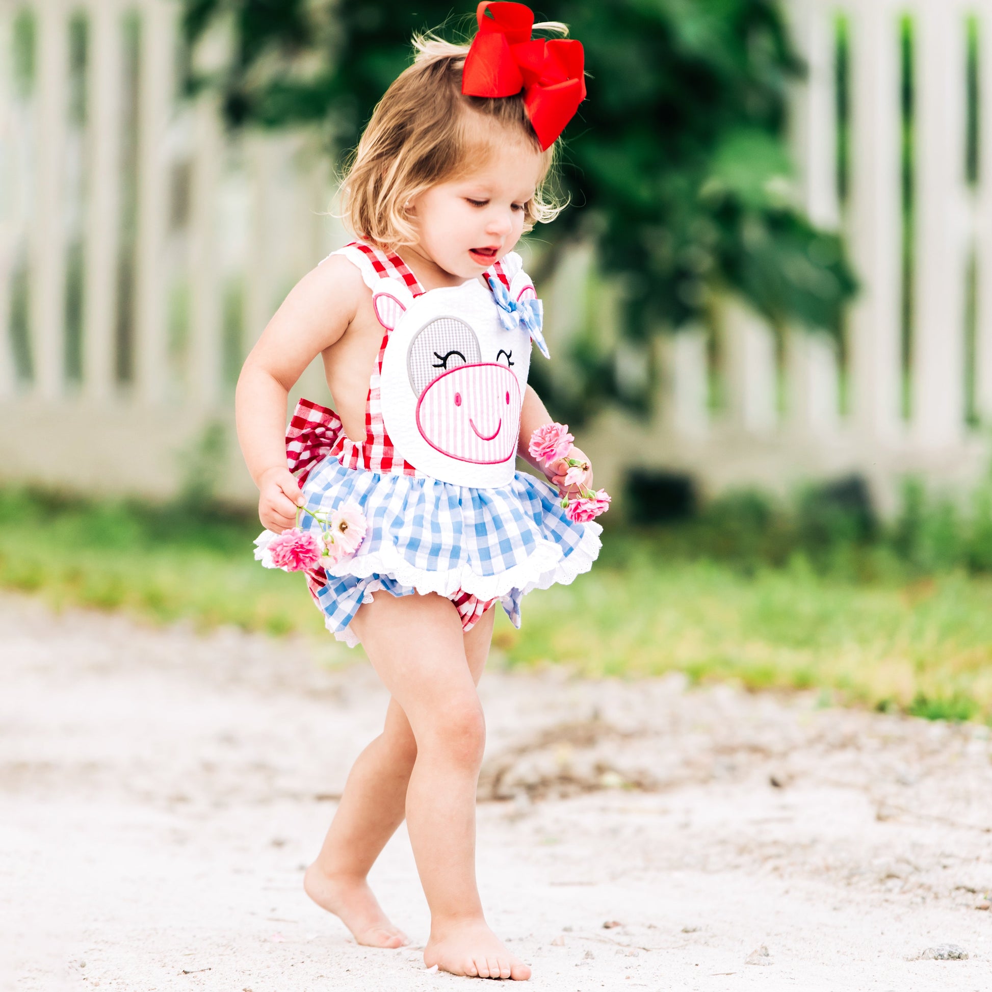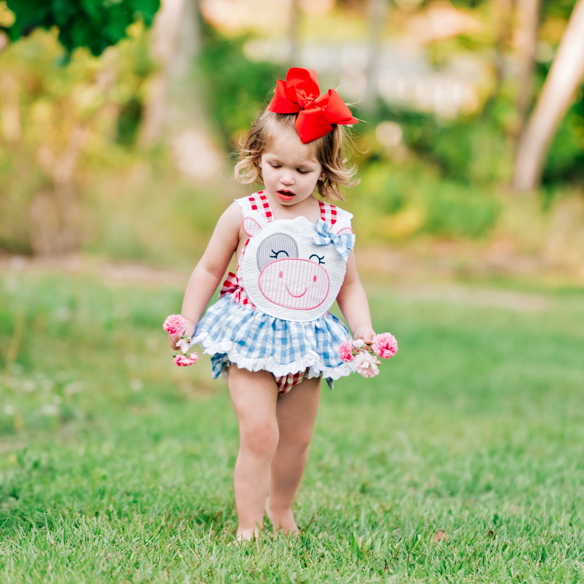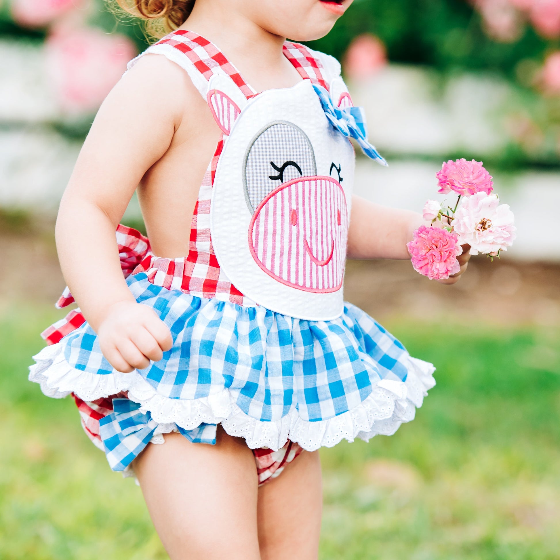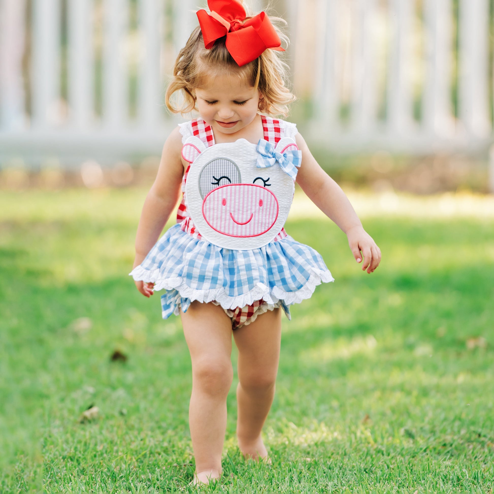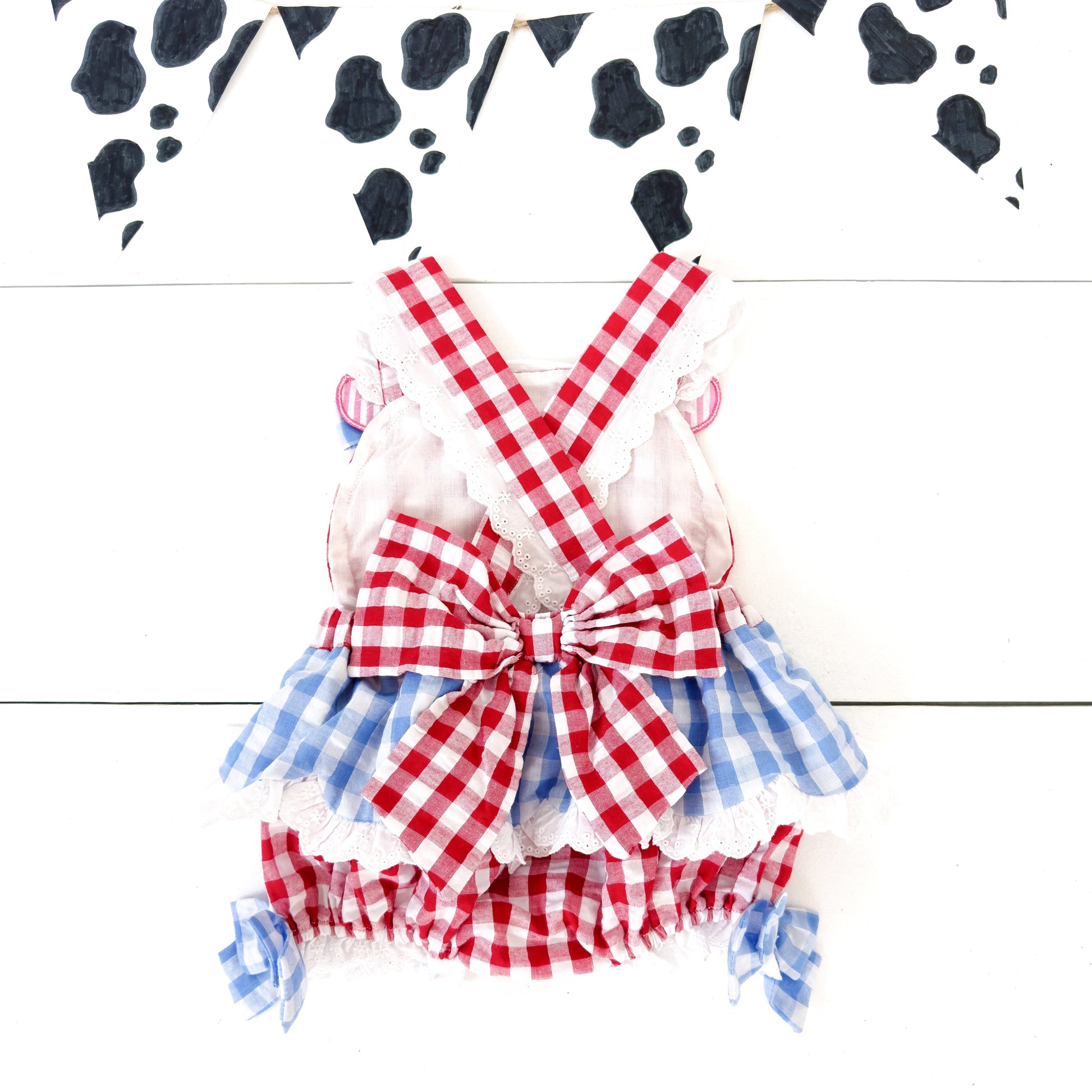 Our Clara The Cow Bubble is udderly adorable! A fun red and blue gingham trimmed with eyelet accents and oodles of ruffles and bows. b The back features a beautiful, oversized bow with adjustable criss-cross straps. This outfit is perfect for a trip to the farm!