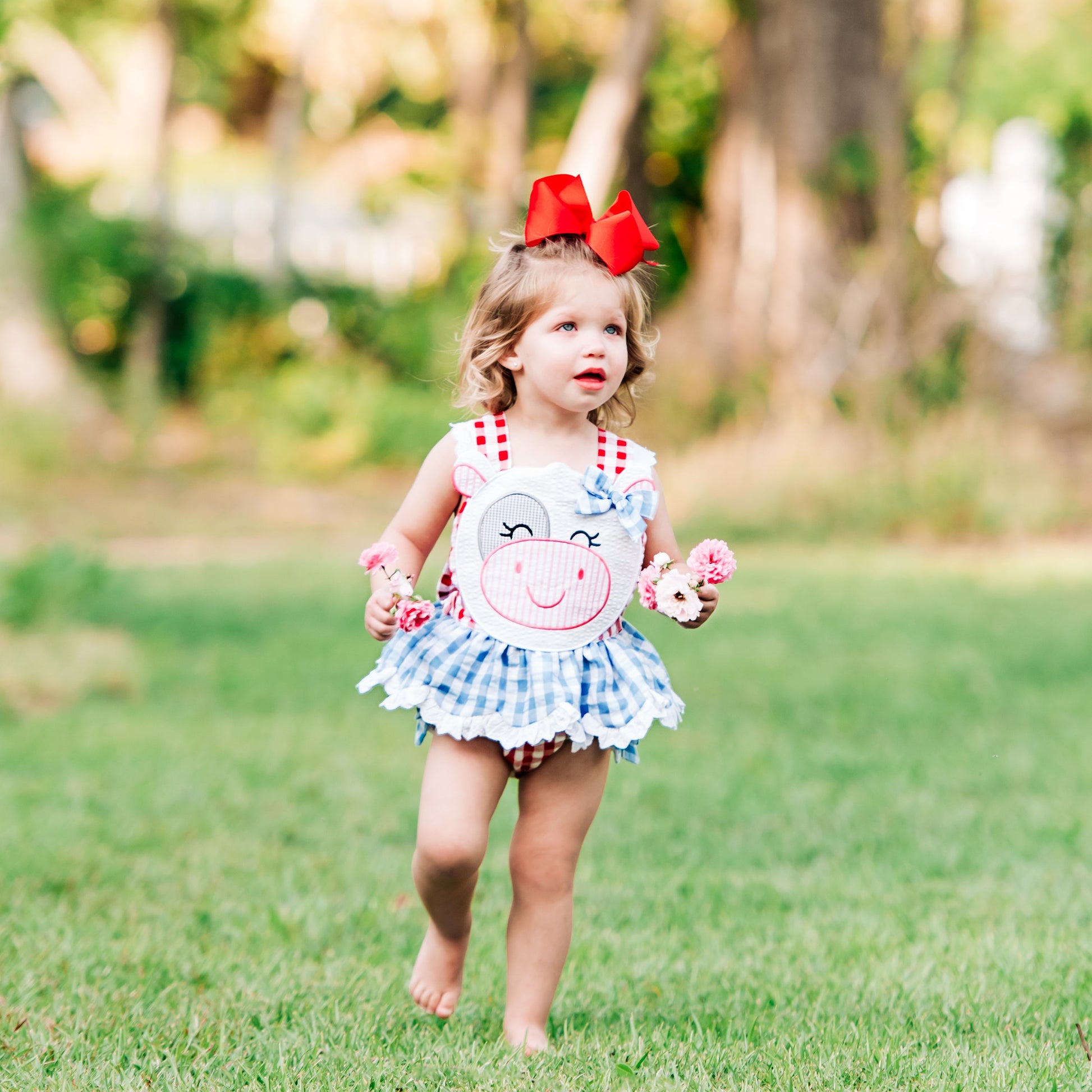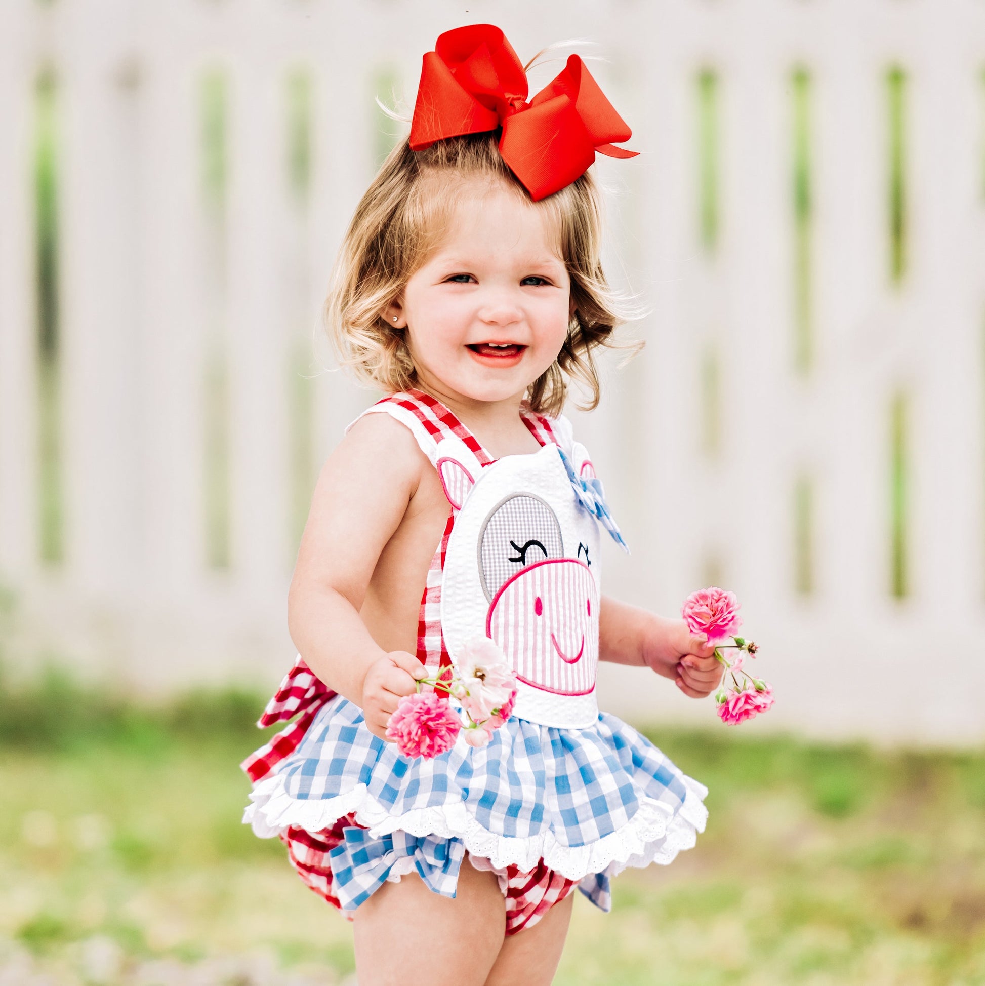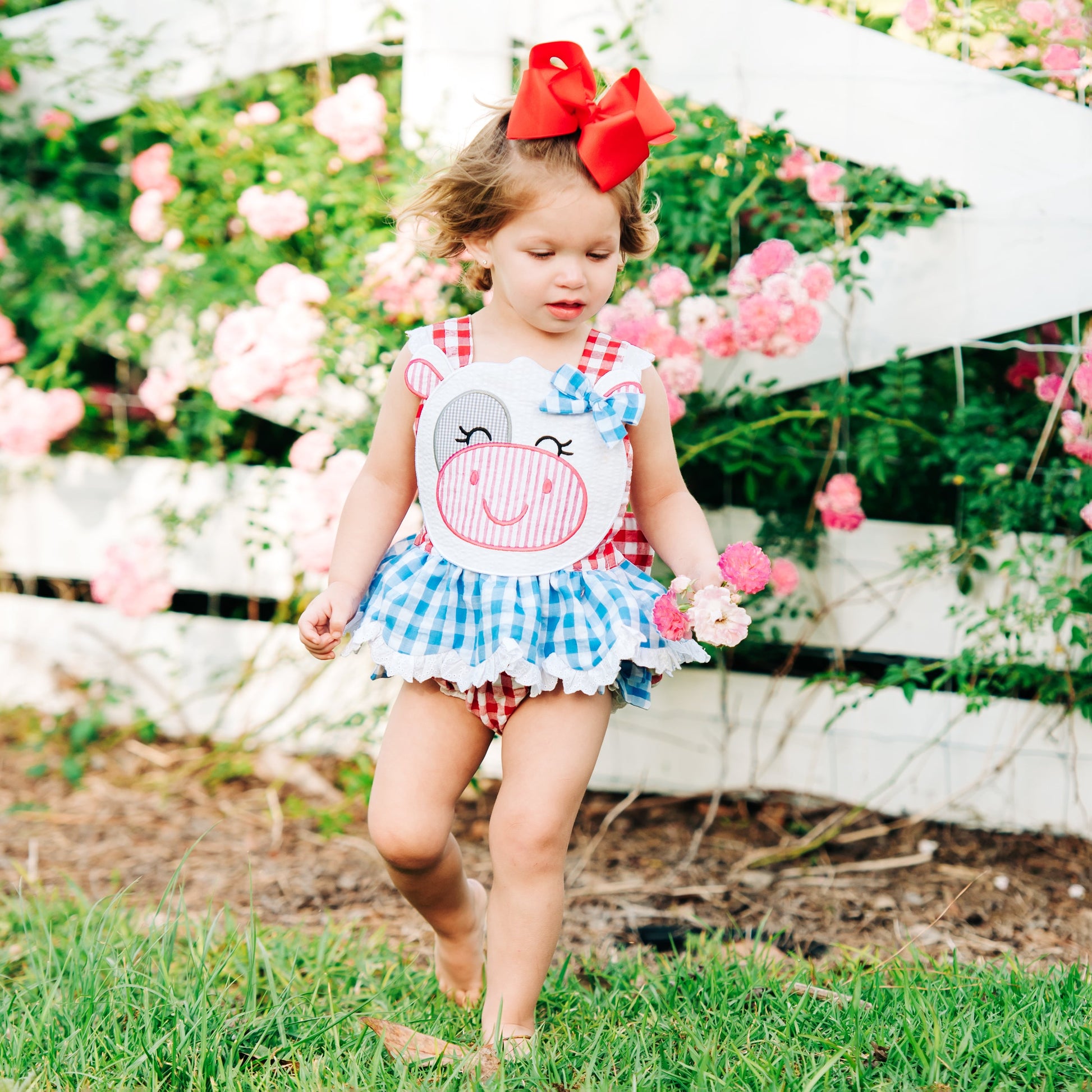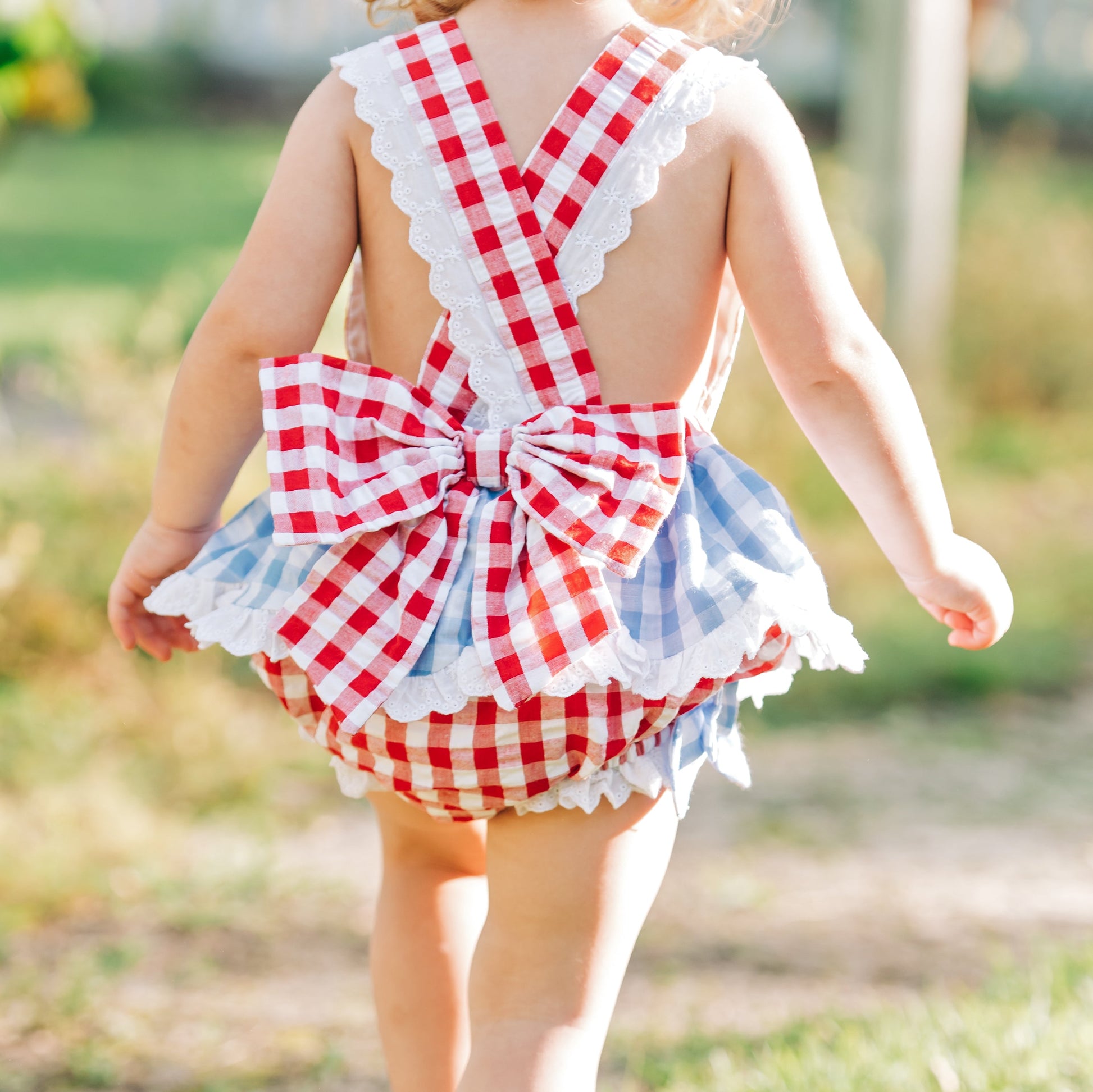 Our Clara The Cow Bubble is udderly adorable! A fun red and blue gingham trimmed with eyelet accents and oodles of ruffles and bows. b The back features a beautiful, oversized bow with adjustable criss-cross straps. This outfit is perfect for a trip to the farm!