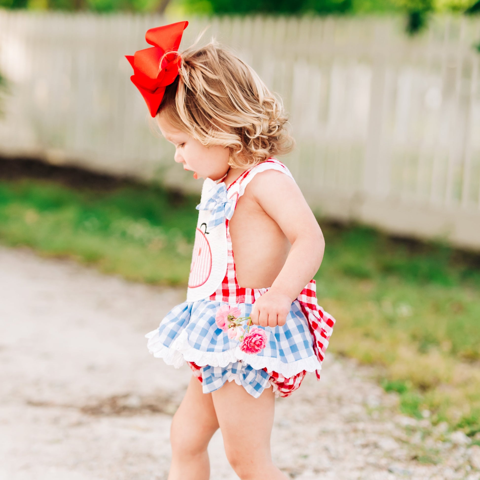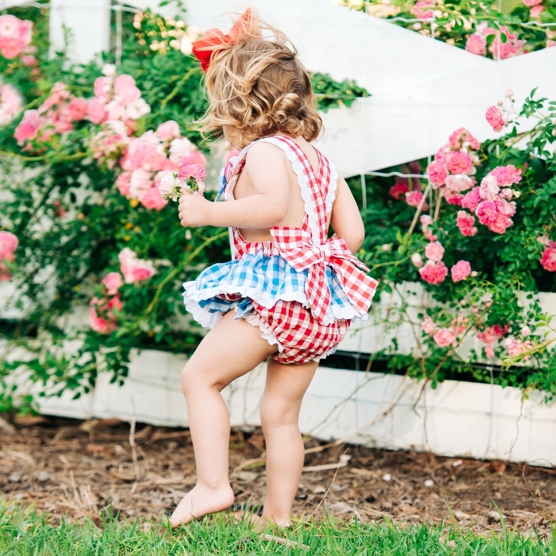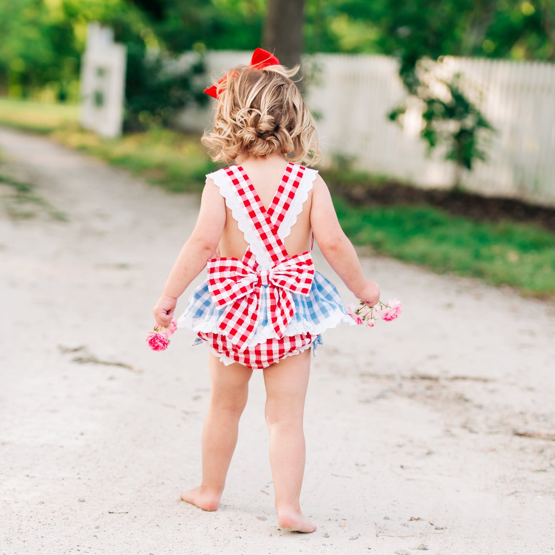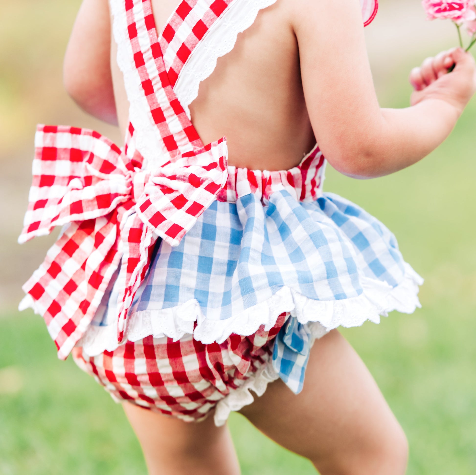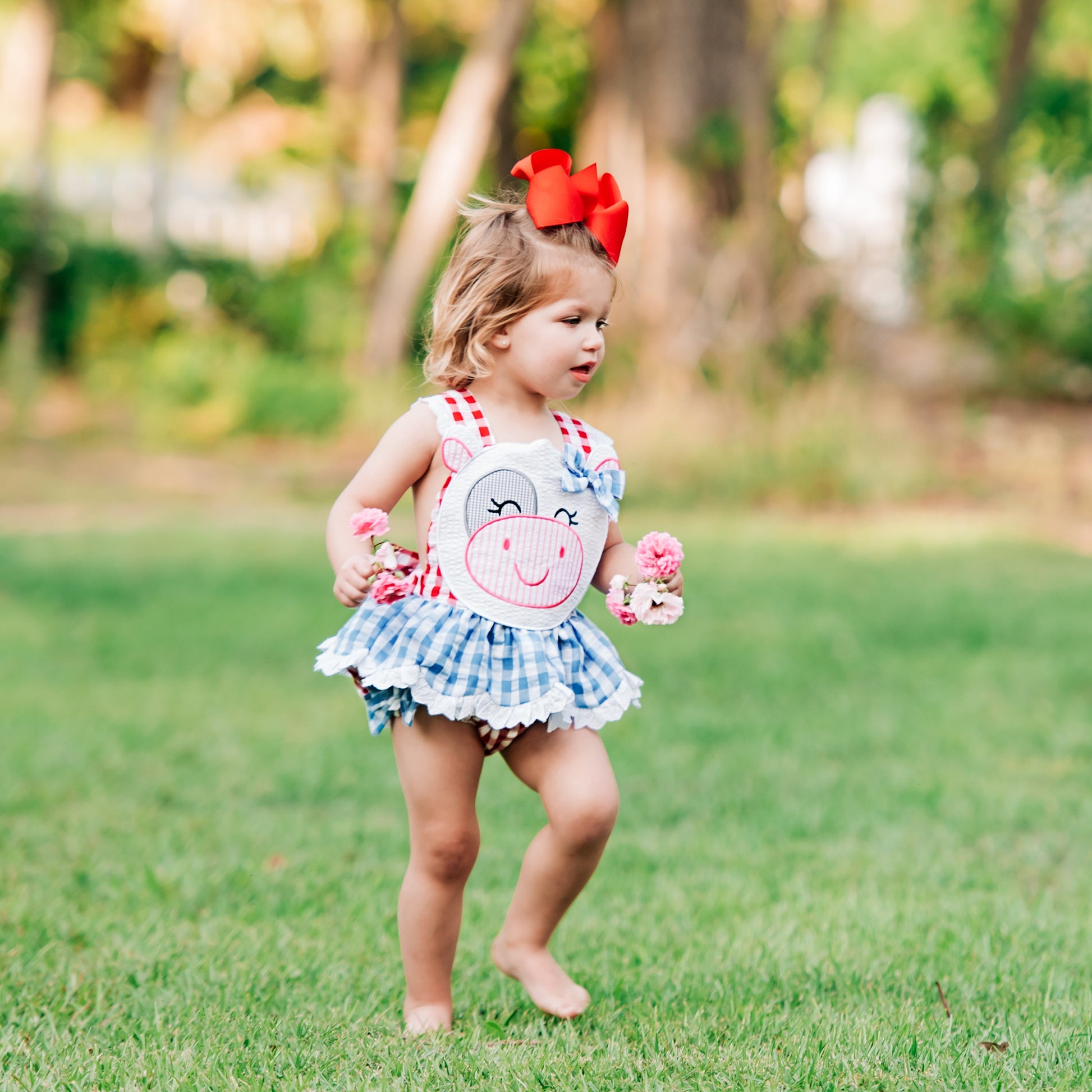 Our Clara The Cow Bubble is udderly adorable! A fun red and blue gingham trimmed with eyelet accents and oodles of ruffles and bows. b The back features a beautiful, oversized bow with adjustable criss-cross straps. This outfit is perfect for a trip to the farm!