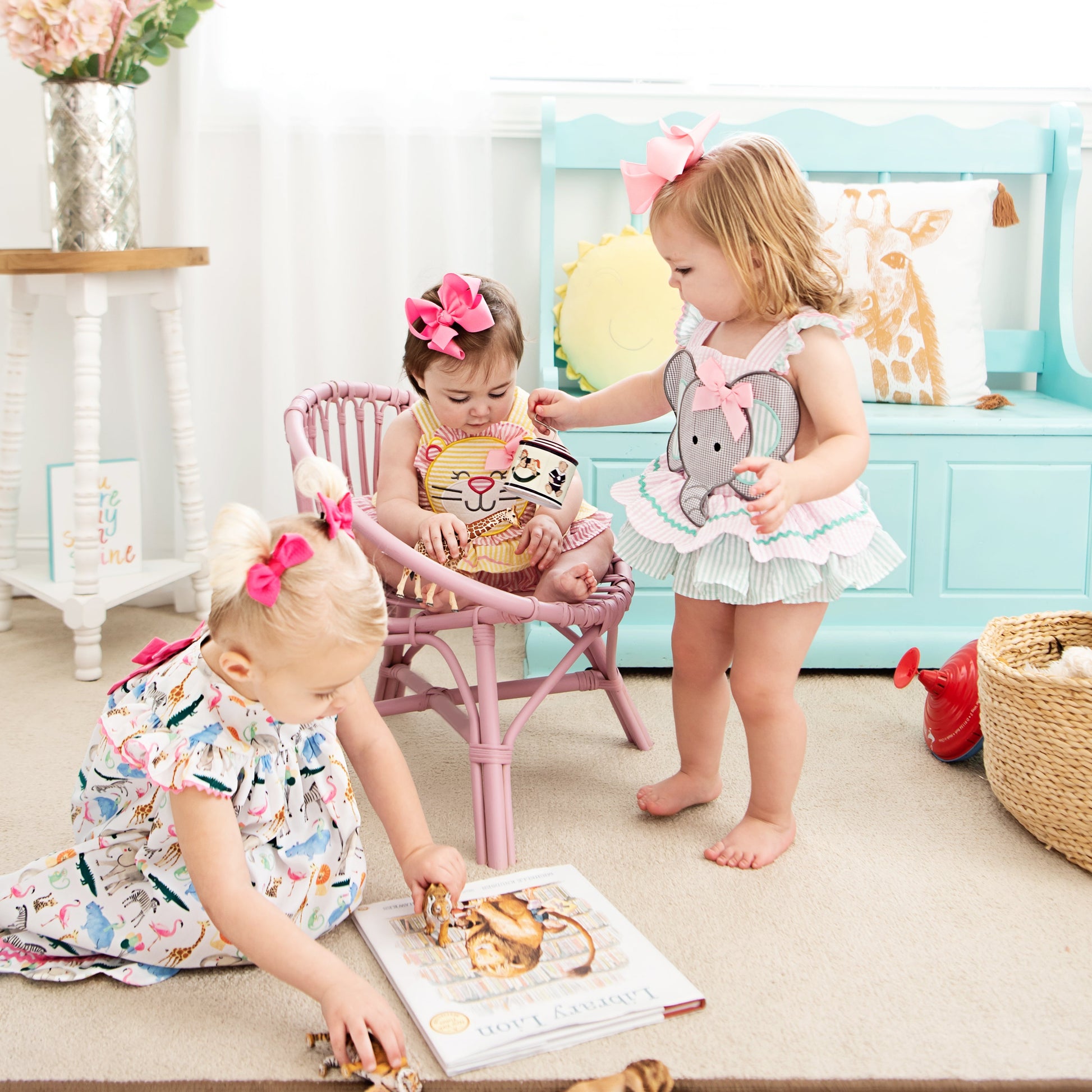 Our Emmie The Elephant Pettiskirt Bubble is bursting with girly details. A whimsical pink and mint seersucker bubble features a double layer pettiskirt accented with ric rac and a scallop hem. The back features a beautiful, oversized bow with adjustable criss-cross straps. This outfit is perfect for a trip to the zoo!
