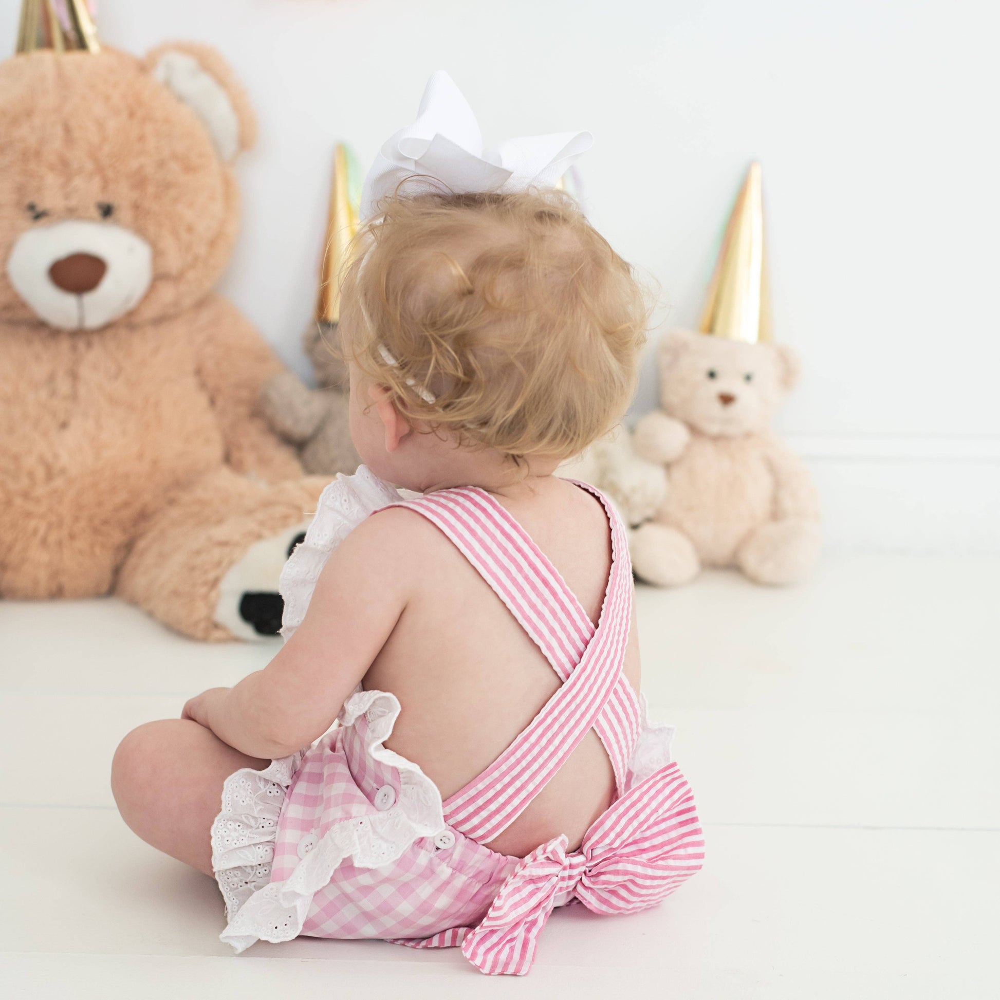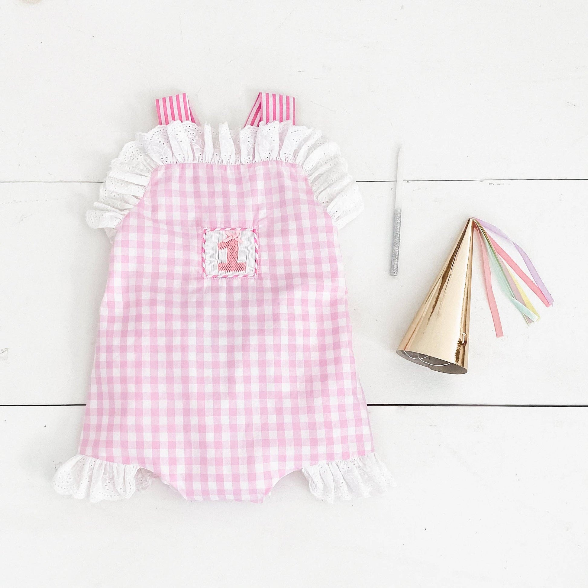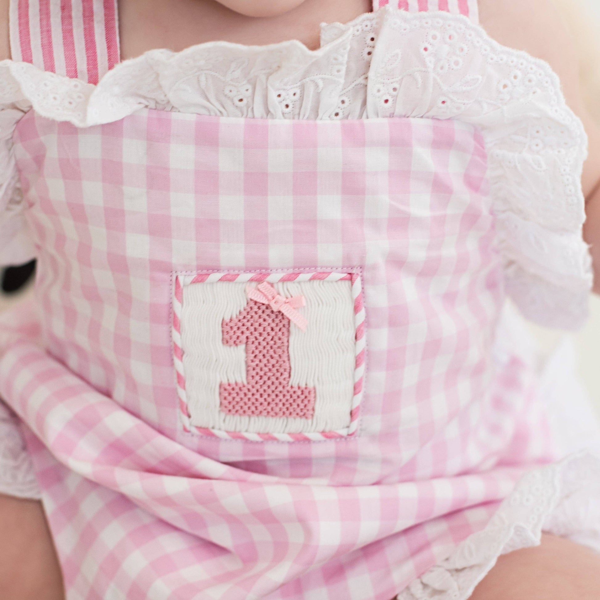 Features & Fit: * 100% cotton * smocked "1" on chest features real bow * criss-cross, adjustable length shoulder straps * oversized, pre-tied bow on bum * button opening on sides * snaps in stride for easy diaper changes * eyelet trim
