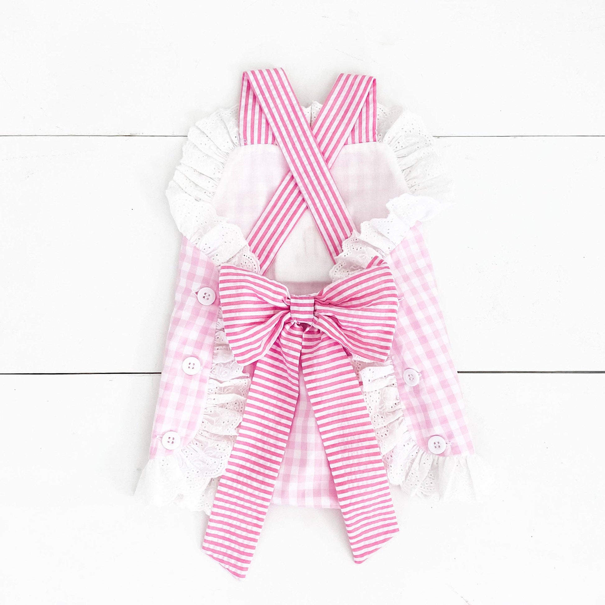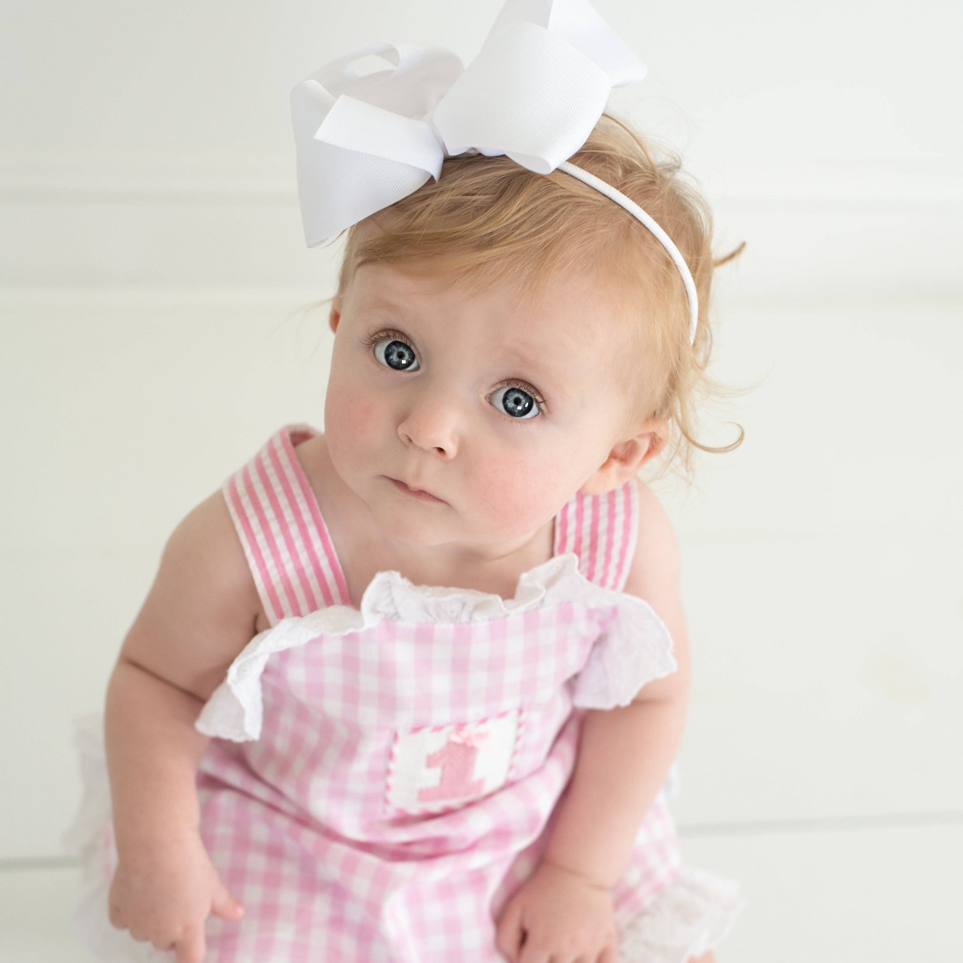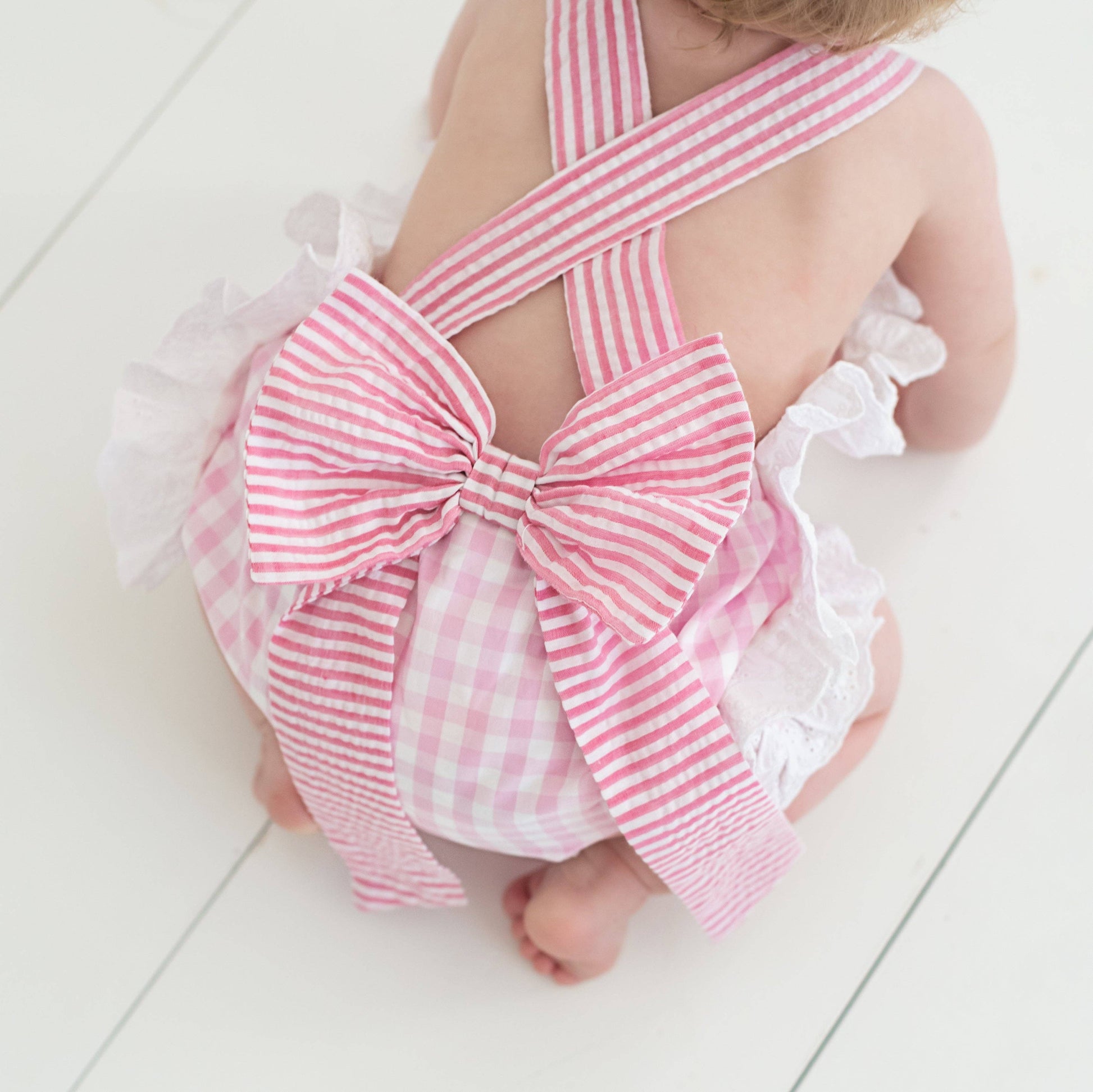 Features & Fit: * 100% cotton * smocked "1" on chest features real bow * criss-cross, adjustable length shoulder straps * oversized, pre-tied bow on bum * button opening on sides * snaps in stride for easy diaper changes * eyelet trim