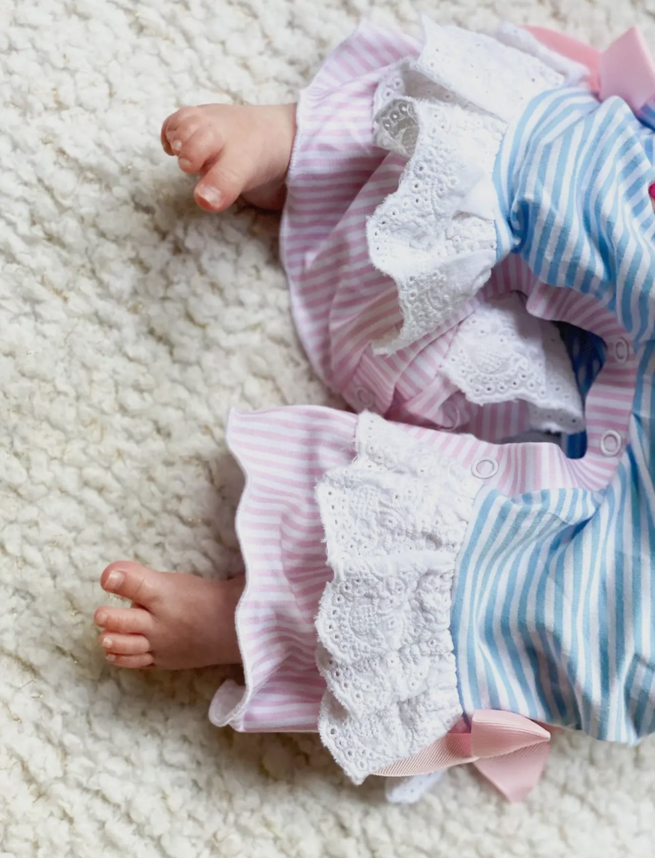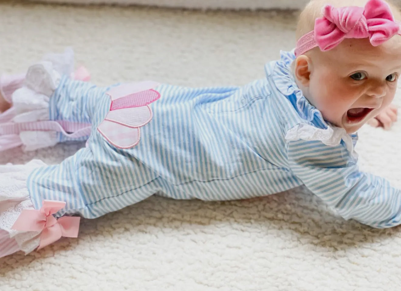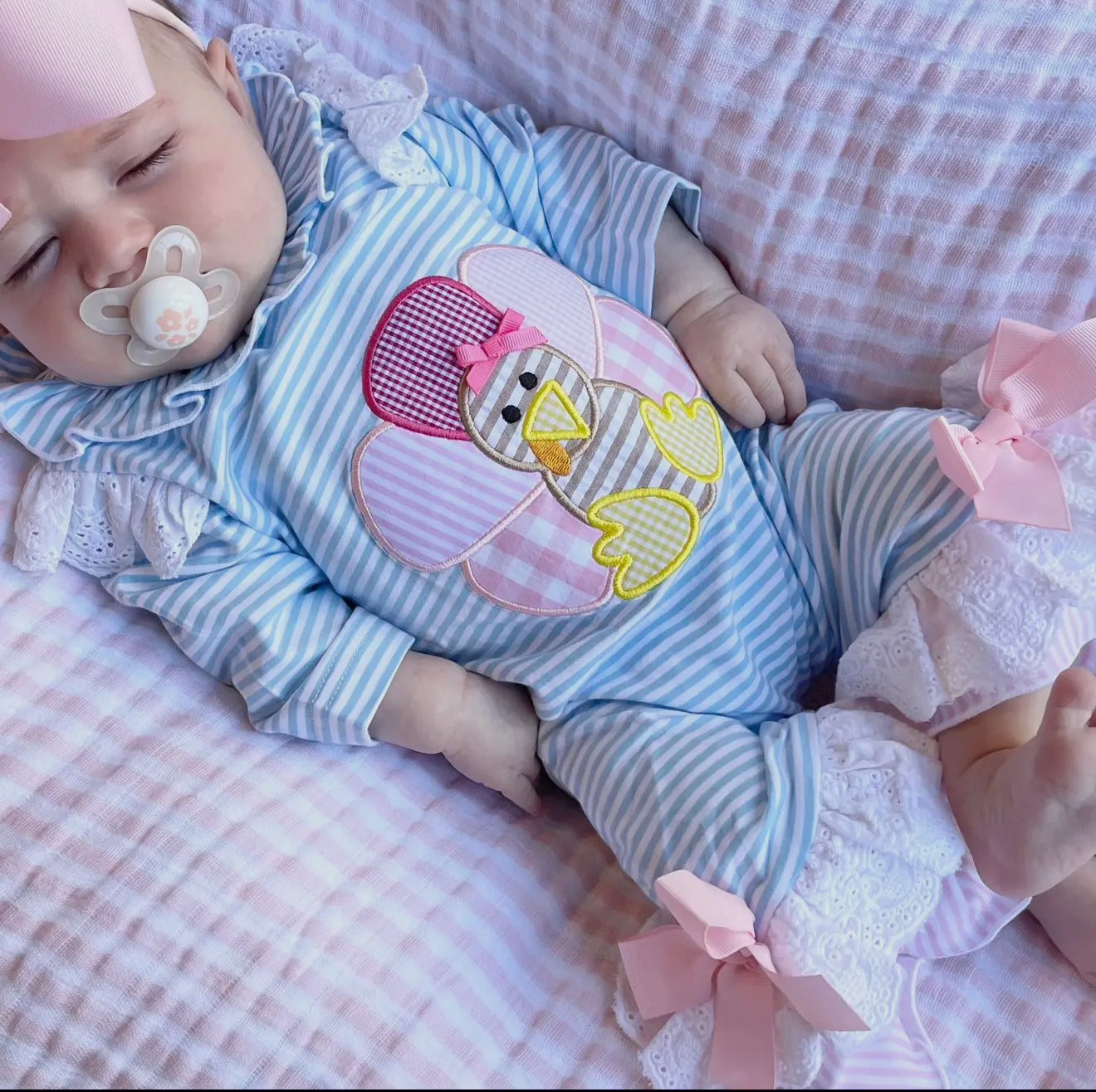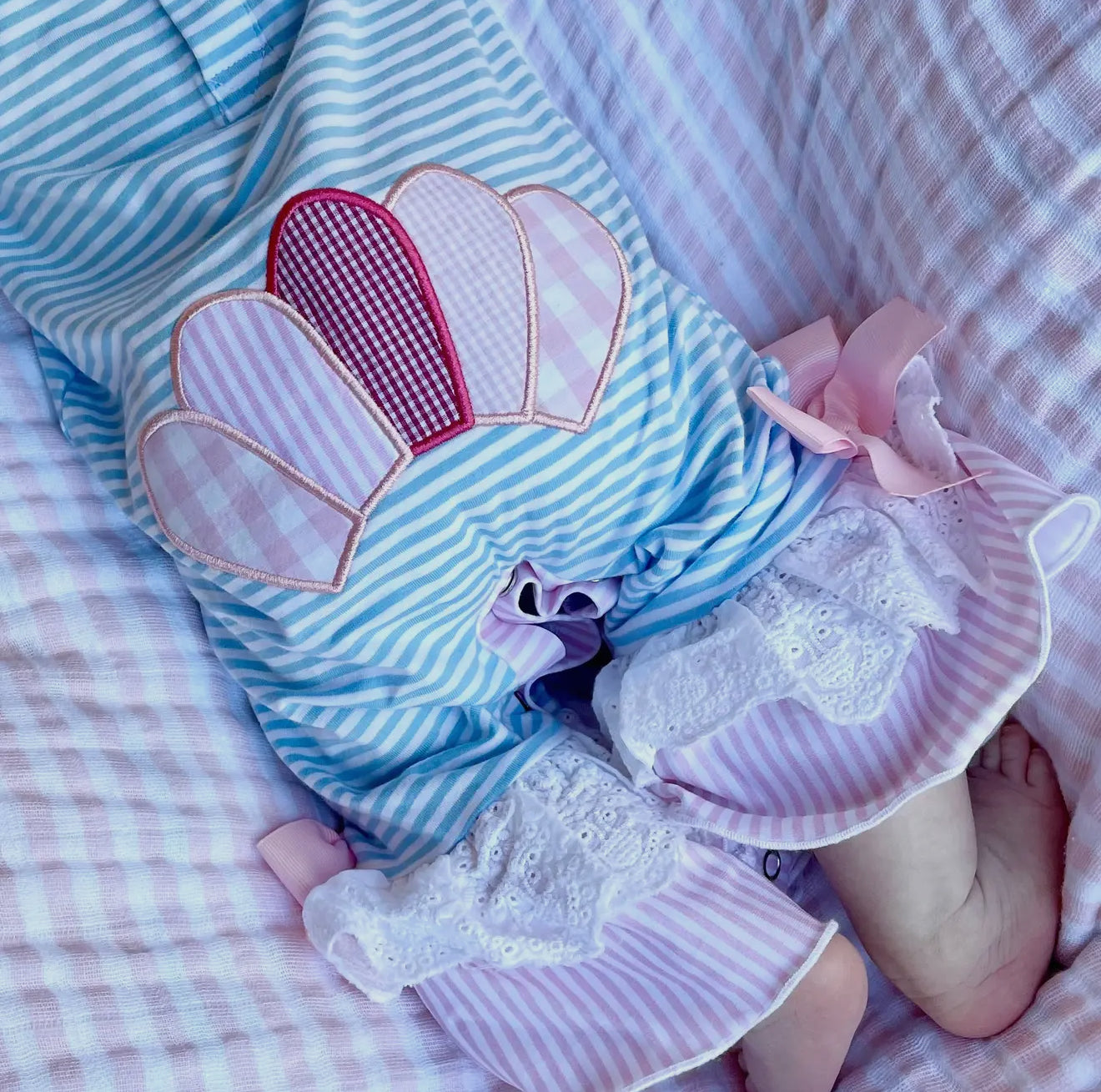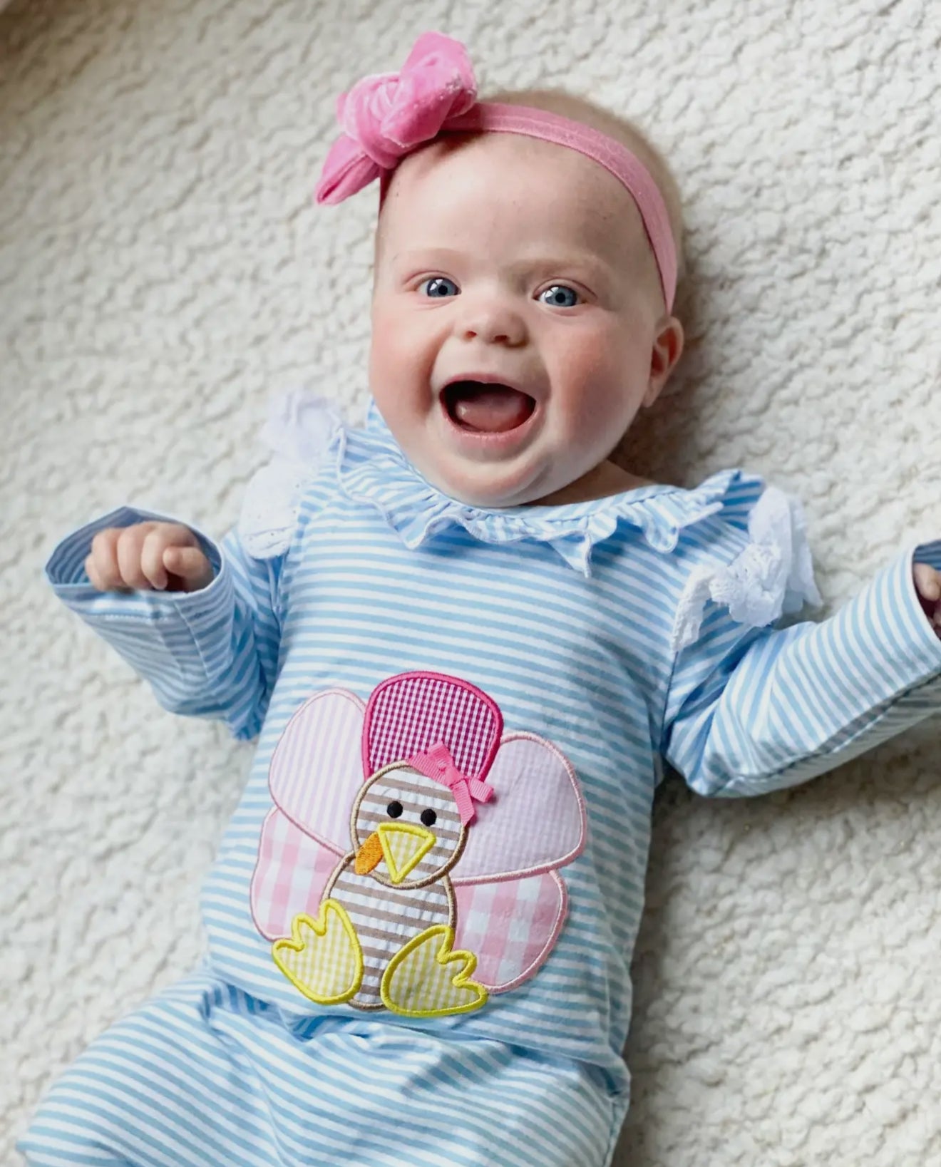 Soft, sweet and comfy knit with an adorable Thanksgiving turkey applique on the chest and adorable turkey tail feathers on the bum. Accented with eyelet trim, ruffles and grosgrain bows.