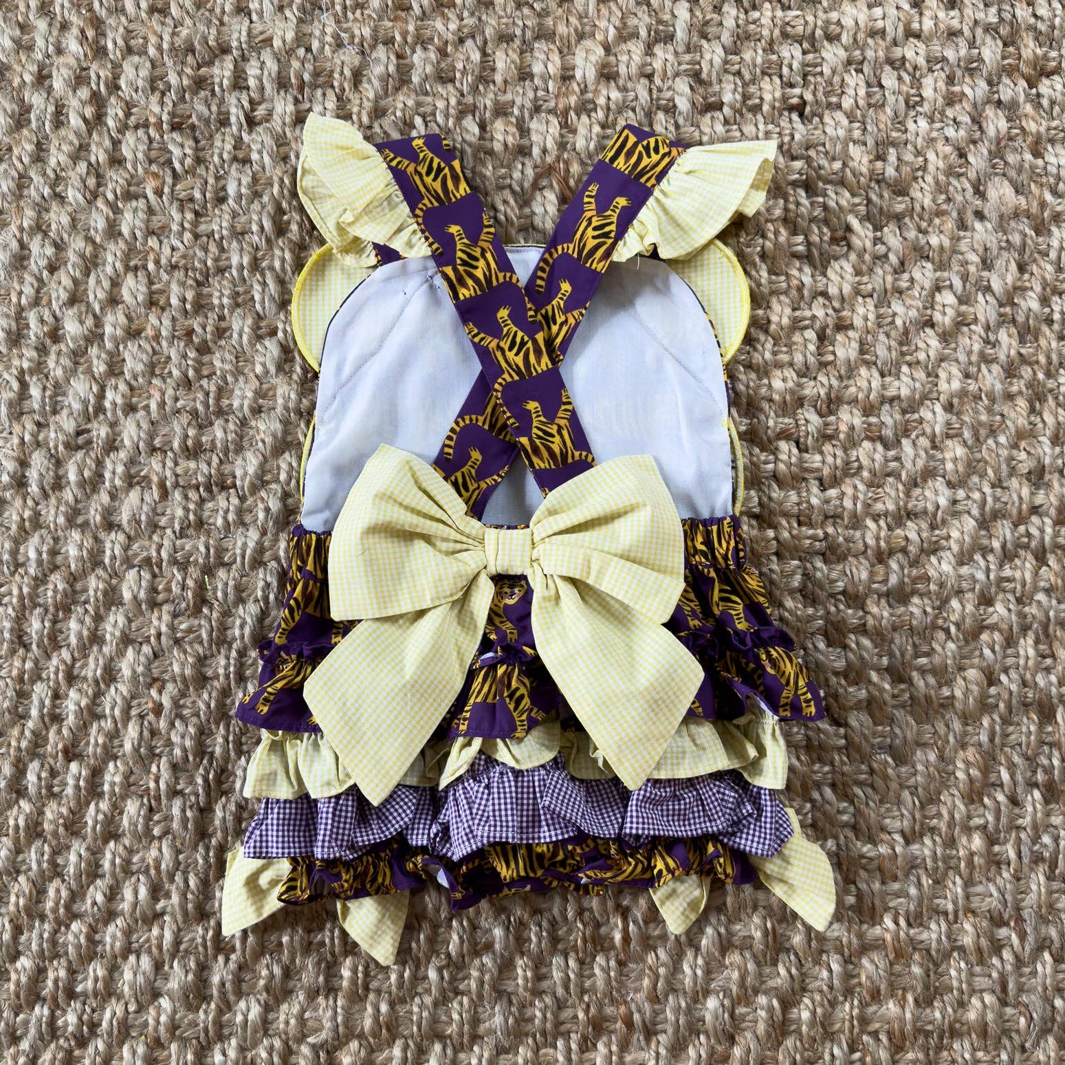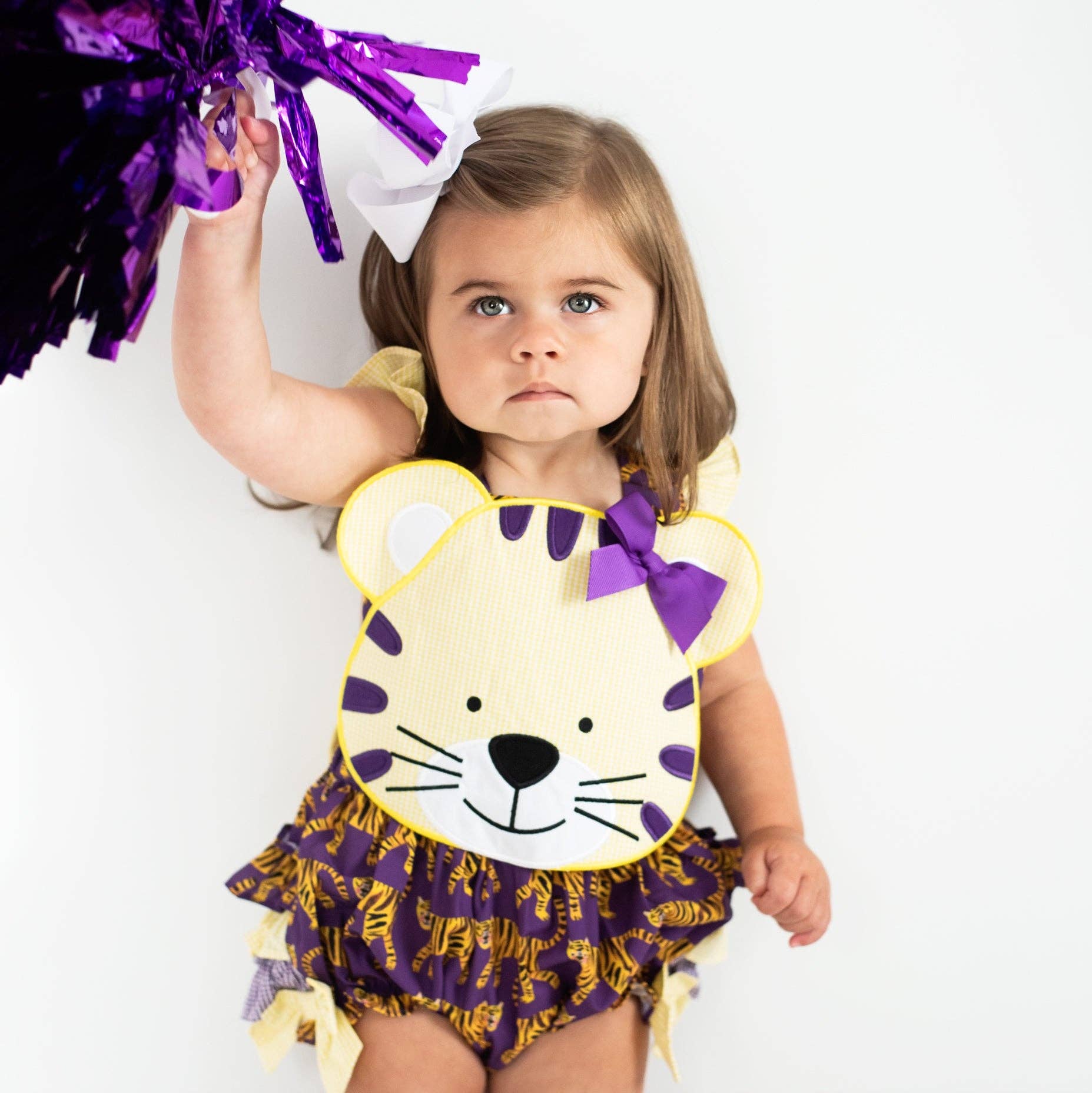 Be Game Day ready for Saturdays in the South with our Gold & Purple Tiger Bubble. This bubble features our custom designed Tiger Game Day print by the talented Katherine Herrell Studio. Adjustable criss-cross straps button in the back.