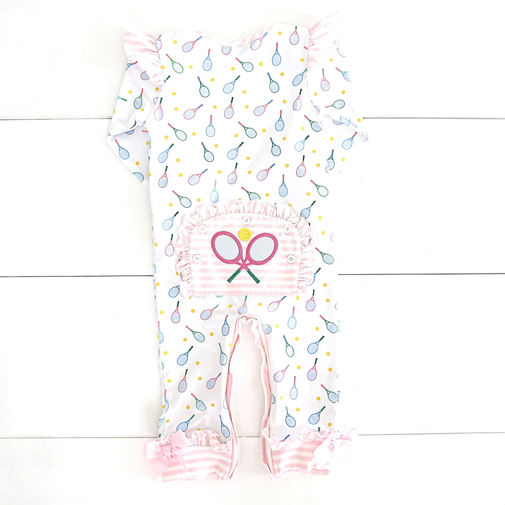 Hit the court in style with our adorable Tennis Romper. Romper features incredibly soft fabric, an adorable custom print and oodles of ruffles.